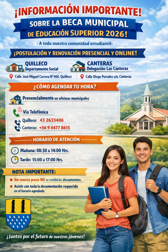 La Ilustre Municipalidad de Quilleco informa a los interesados en el proceso de Postulación y Renovación de la Beca Municipal de Educación Superior 2026, que se ha determinado complementar la modalidad de recepción de documentos.